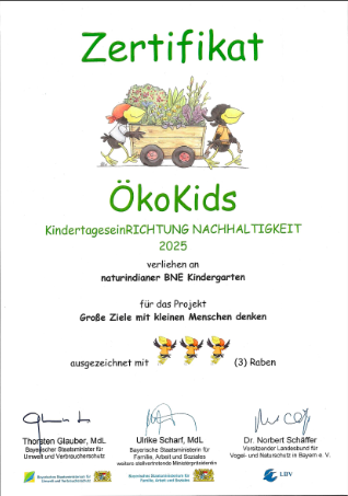Die Auszeichnung wurde im Jubiläumsjahr des Projekts ÖkoKids vergeben, das heuer sein 15-jähriges Bestehen feiert. Insgesamt ehrten der Landesbund für Vogel- und Naturschutz (LBV) gemeinsam mit dem Bayerischen Staatsministerium für Umwelt und Verbraucherschutz bayernweit 245 Kindertageseinrichtungen für ihr vorbildliches Engagement in der Bildung für nachhaltige Entwicklung.