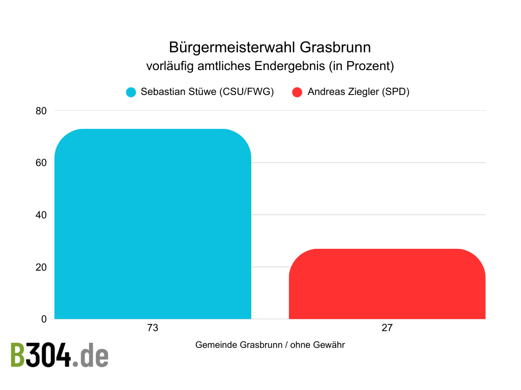 Mit einem klaren Ergebnis hat sich Sebastian Stüwe (CSU/FWG) am Sonntagabend bei der Bürgermeisterwahl in Grasbrunn durchgesetzt. Der 40-jährige Verwaltungsfachmann erhielt am Ende 73 Prozent der Stimmen und wird damit neuer Rathauschef. Er folgt auf Klaus Korneder (SPD), der nach 18 Jahren im Amt nicht mehr kandidiert hatte.