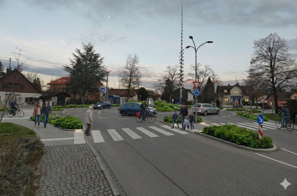 Florian Edelmann, Grünen-Gemeinderatskandidat: “Die Maibaum-Kreuzung in Vaterstetten wird in nahezu jeder Bürgerversammlung negativ erwähnt: Sie ist groß, schlecht einsehbar und die Autos fahren dort viel zu schnell in den Ort hinein. Daher möchte ich mich dort für einen Kreisverkehr einsetzen, der die Situation für alle Verkehrsteilnehmer:innen übersichtlicher und sicherer macht. Autos auf der Dorfstraße müssen mehr herunterbremsen, gleichzeitig müssen aber Autos und Radl aus Fasanen- und Carl-Orff-Straße nicht mehr so lange an der Kreuzung stehen und warten. Außerdem wird die Querung für Fußgänger:innen durch Zebrastreifen auf allen Seiten erleichtert.” (Foto: KI generiert)