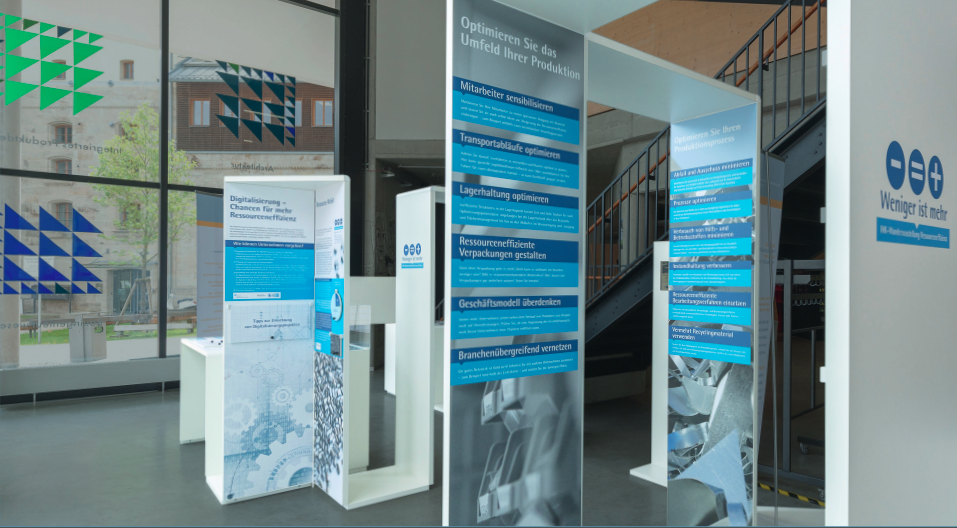 Die modern und modular gestaltete Ausstellung lädt Besucherinnen und Besucher ein, das Thema entlang eines anschaulichen „Kreislaufs der Ressourceneffizienz“ zu entdecken. Dabei wird deutlich: Ressourcenschonendes Wirtschaften ist in allen Phasen des Produktlebenszyklus möglich – von der Rohstoffgewinnung über die Produktion bis hin zu