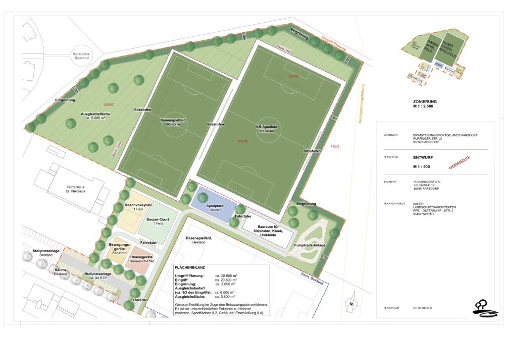 Ein vom FC Anzing Parsdorf vorgelegter Plan sieht neben einem Kunstrasen- und einem Rasenplatz auch eine Pumptrack-Anlage für BMX, ein Beachvolleyballfeld sowie einen Trimm-dich-Pfad vor. Im Gemeinderat stieß der große Umfang der Planung auf Kritik. Die vollständige Umsetzung wurde angesichts der Kosten als „Wunschkonzert“ bezeichnet, auch der Kämmerer äußerte sich zurückhaltend. Dennoch reichte die Gemeinde für das Förderprogramm bewusst die umfassende „große“ Planskizze ein.