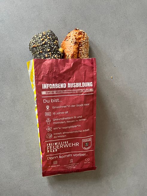 Auf kreativerem Weg versucht die Freiwillige Feuerwehr Haar junge Menschen für sich zu gewinnen: Seit Anfang Oktober werden in Haarer Bäckereifilialen Brote, Semmeln und Brezen in auffällig bedruckten Tüten verkauft, die zu einem Infoabend der Feuerwehr Haar einladen.