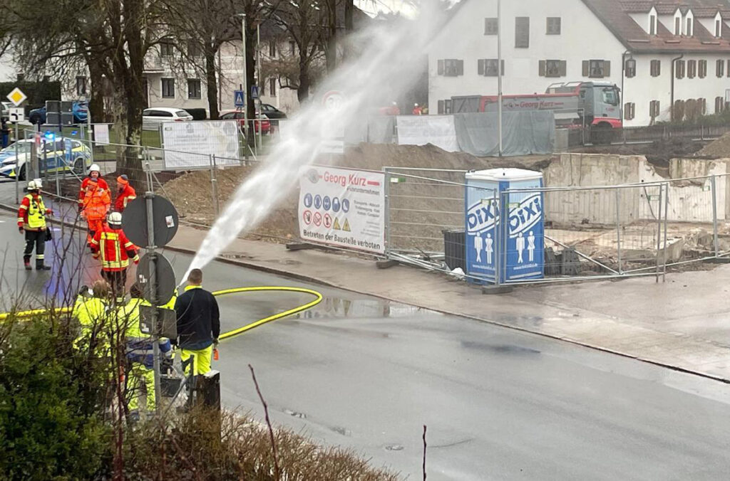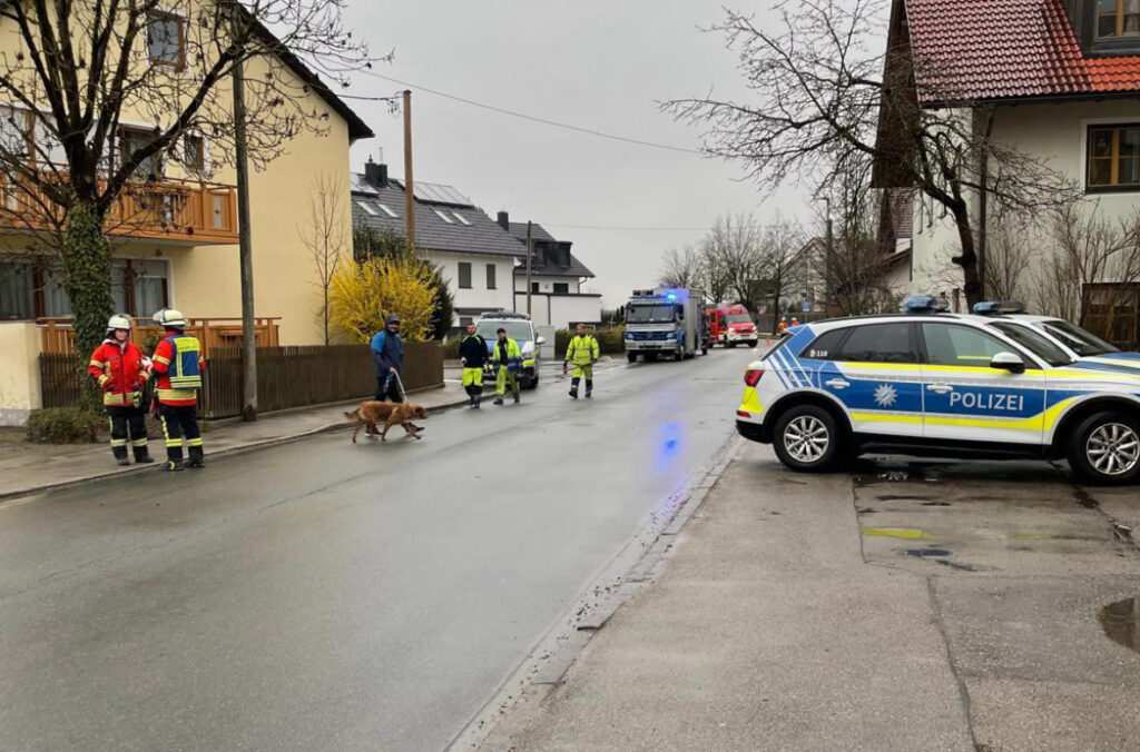 Rund 1,5 Stunden musste am heutigen Dienstag (17. März 2026) das Gebiet rund um den St. Ulrich-Platz in Grasbrunn weiträumig abgesperrt werden. Bei den Abrissarbeiten des Grasbrunner Hofs war ein Gastank entdeckt und beschädigt worden. (Foto: Freiwillige Feuerwehr Grasbrunn)