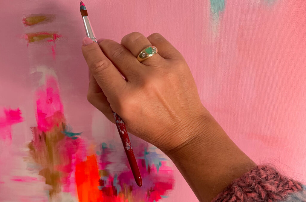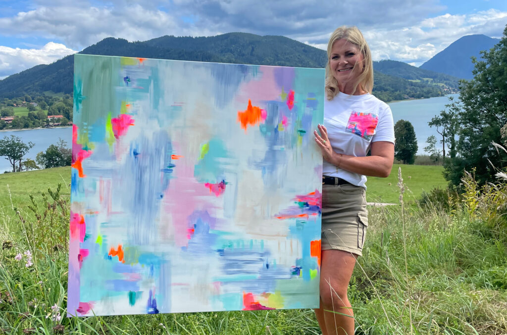 Wer Tinas Atelier im Untergeschoss eines Architektenhauses in Baldham betritt, merkt sofort: Hier wird´s bunt, hier darf es richtig knallen. Leuchtende Farben strahlen um die Wette, großformatige Leinwände stapeln sich, überall stehen (halb-)fertige Bilder, Tuben und Dosen mit Acrylfarbe, Spachtel, Pinsel, diverse Staffeleien. Und mittendrin eine blonde, lächelnde Frau, die wirkt, wie direkt aus einer Macaron-Schachtel gehüpft. Und letztlich kommt dieser zuckersüße Vergleich ihrem bunten Atelier auch ein bisschen nahe.