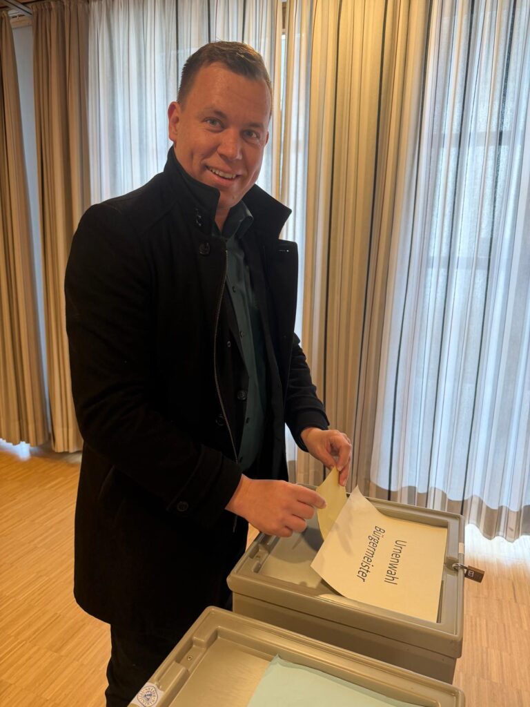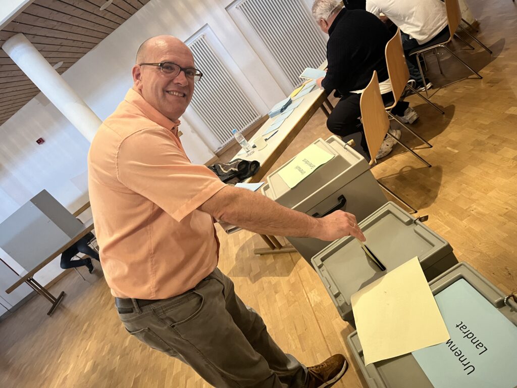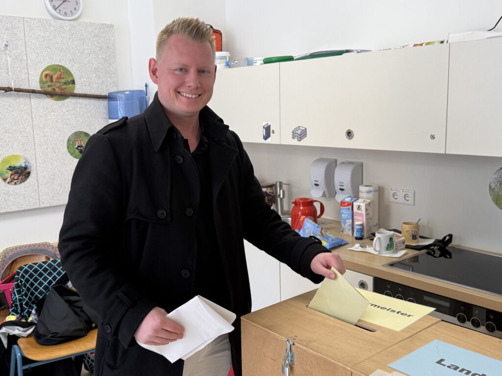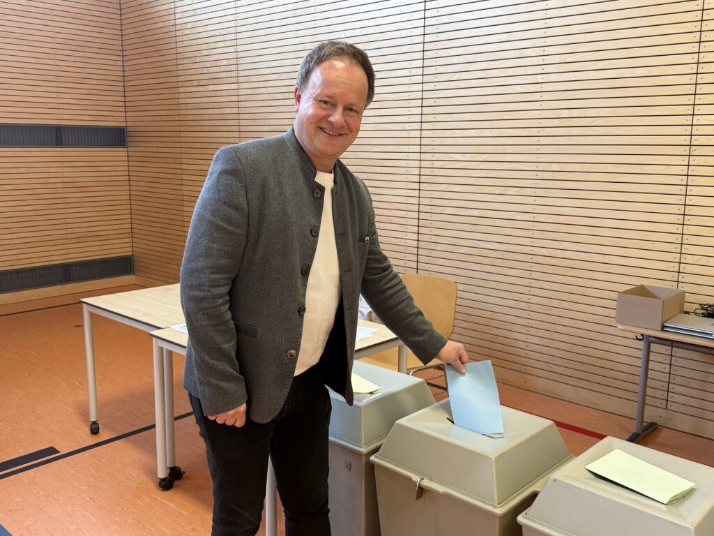 16.30 Uhr – Auch Sebastian Stüwe, Kandidat der CSU und der Freien Wählergemeinschaft, hat inzwischen in Neukeferloh gewählt. Er wird das Auszählen der Stimmen in Grasbrunn in der Pension Jagermo, mit Parteikollegen verfolgen.