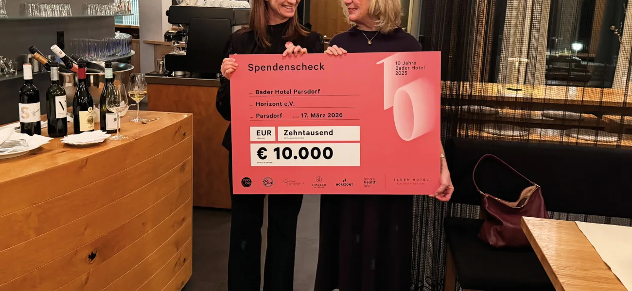 Hotelchefin Monika Hobmeier ist auf einem Bauernhof in Parsdorf groß geworden, hat weltweit in Hotels gearbeitet und mit ihrem schwedischen Ehemann einige Jahre in dessen Heimat gelebt. Kein Wunder, dass so viel skandinavisches Design und bayerische Leichtigkeit ins Bader Hotel – erbaut auf einem Grundstück ihrer Eltern – eingezogen sind. Seit mittlerweile zehn Jahren gibt es das Haus mit seinen 50 puristisch designten Vollholzzimmern. Doch statt einer großen Jubiläumsfeier hat sich Monika Hobmeier für ein großzügiges Geschenk entschieden: eine 10.000 Euro-Spende an den „Horizont“-Verein von Jutta Speidel.