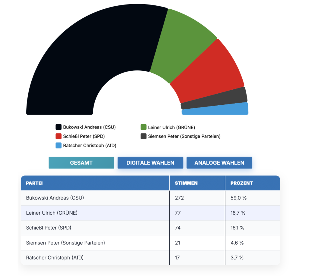 Knapp 60.000 Minderjährige gaben bayernweit ihre Stimme ab, was zum ersten Mal auch vereinzelt online möglich war. Bei den bayernweiten Bürgermeisterkandidaten führt die CSU (29%), gefolgt von SPD (24,3%), Grünen (10,8%), Wählergruppen (10,4%) und den Freien Wählern (6,9%). Linke-Kandidaten erhielten 5,4%, die AfD 4,5%.