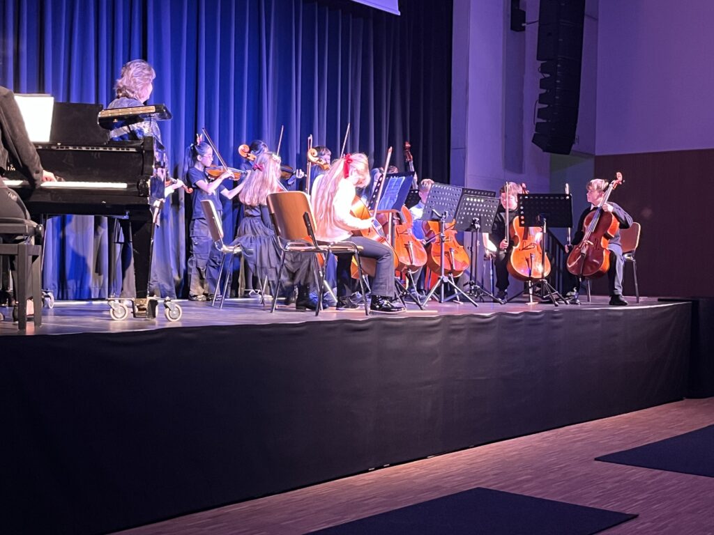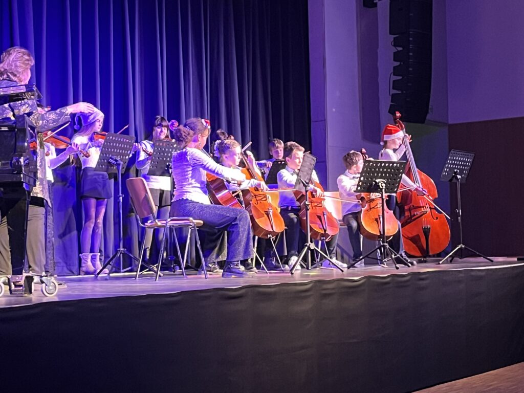 Anschließend zeigten die jüngsten Musikerinnen und Musiker ihr Können: Die Streicherklasse 5, die erst seit Beginn dieses Schuljahres ihre Instrumente erlernt, spielte unter der Leitung von Silvia Schmidbauer und begleitet von Lara Schmidbauer am Klavier den Klassiker „Morgen kommt der Weihnachtsmann“. Die Streicherklasse 6 ließ mit der bekannten Melodie aus „Drei Nüsse für Aschenbrödel“ nostalgische Weihnachtsgefühle aufkommen und zauberte mit ihren Klängen einen Hauch von Winter und Schneeflocken in den Neubau der Schule.